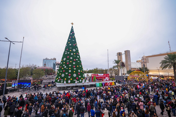 Bajo las luces del majestuoso pino, la ceremonia marcó el inicio de las fiestas decembrinas, en la que la primera autoridad municipal invitó a los reynosenses a fortalecer los lazos familiares de unión, amor, fe y esperanza en esta Navidad y les deseó un próspero 2025.